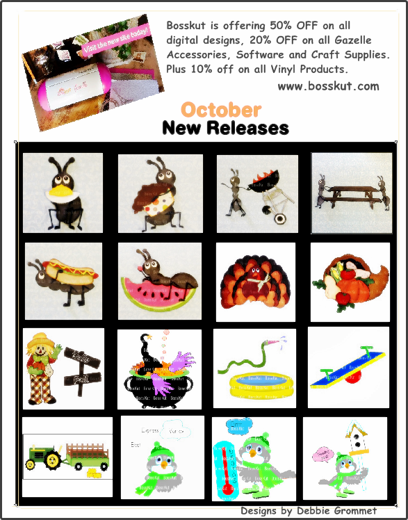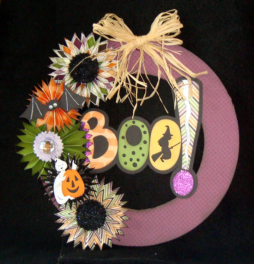I began by trimming my purple Blue Bunny Dot  patterned paper to 6.75”x6.75”  then distressed and inked the outer edge.  After adhering  it to the frame I used my exacto knife and cut out the center then filed it with a fingernail file and inked it as well.  Next, I cut the JS0038  Spider Web using  Silver Glitter Paper and adhered it directly to the glass that came in the frame.  The spider needed a little something so I gave him googlie eyes then used pop dots to stick him to the web.  I cut and assembled LS0858  Witch  Hugger and added her along the top of the open edge of the window.  She fits there perfectly, don’t you think??  To give her a little zing, I used Silver Glitter Paper for her hair.  And, since no witch could live without her broom or cauldron I cut #0846 Broom and#0490 Cauldron and inked, assembled and adhered them.  For the bubbles of the cauldron, I used Kiwi Green Glitter Paper.  To create the calendar, I cut 31 pumpkins using the #0848 Pumpkin and inked ‘em up before adding the numbers.  The font used for the numbers was Old English and can be found in the Funtime software. Since the numbers were kind of small, I used my 100 Black Copic marker to run around the edges…easier than inking when you’re dealing with smaller die cuts.  I used the same technique on the leaves using my E57 Light Walnut Copic.  Each pumpkin is backed with a small magnet so it can easily be changed daily. Here’s a view of all my finished pumpkins